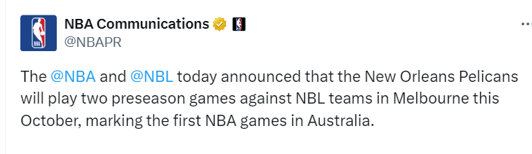 NBA将首次在澳大利亚举办季前赛 鹈鹕今年10月前往墨尔本连战2场