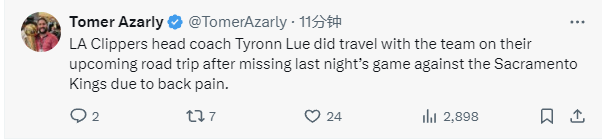 2025-03-11 08:30北京时间3月11日,根据快船队记者Tomer Azarly报道,快船队主教练泰伦-卢将会随队出征接下来的客场比赛。
