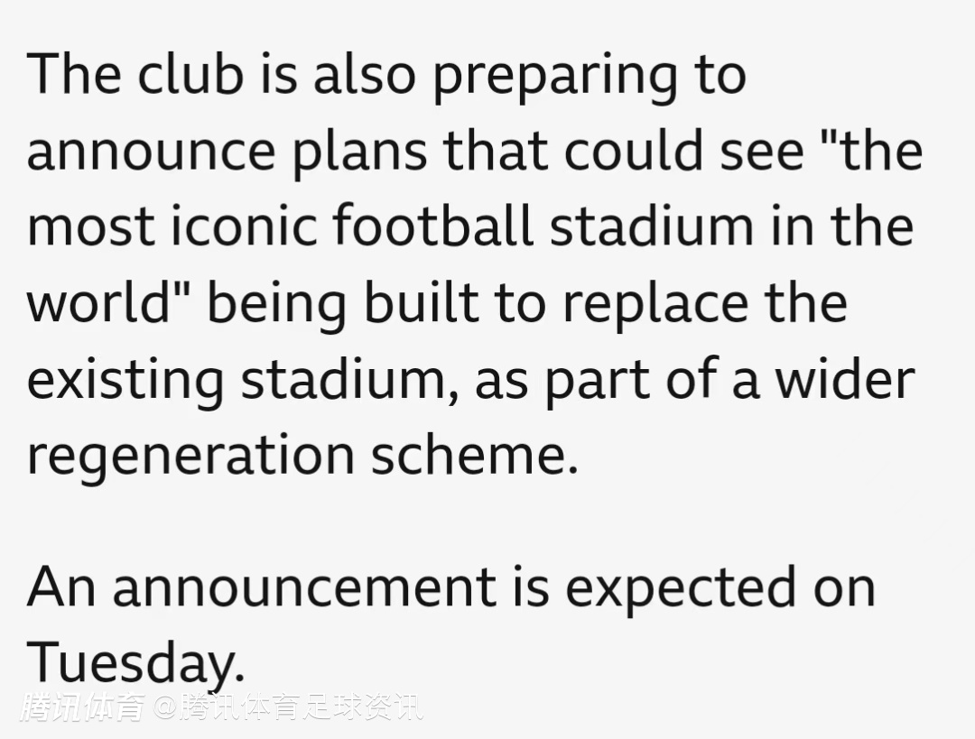 据悉,曼联俱乐部正准备宣布一项计划,可能会建造“世界上最标志性的足球场”来取代现有的球场,作为更广泛的城市更新计划的一部分。
