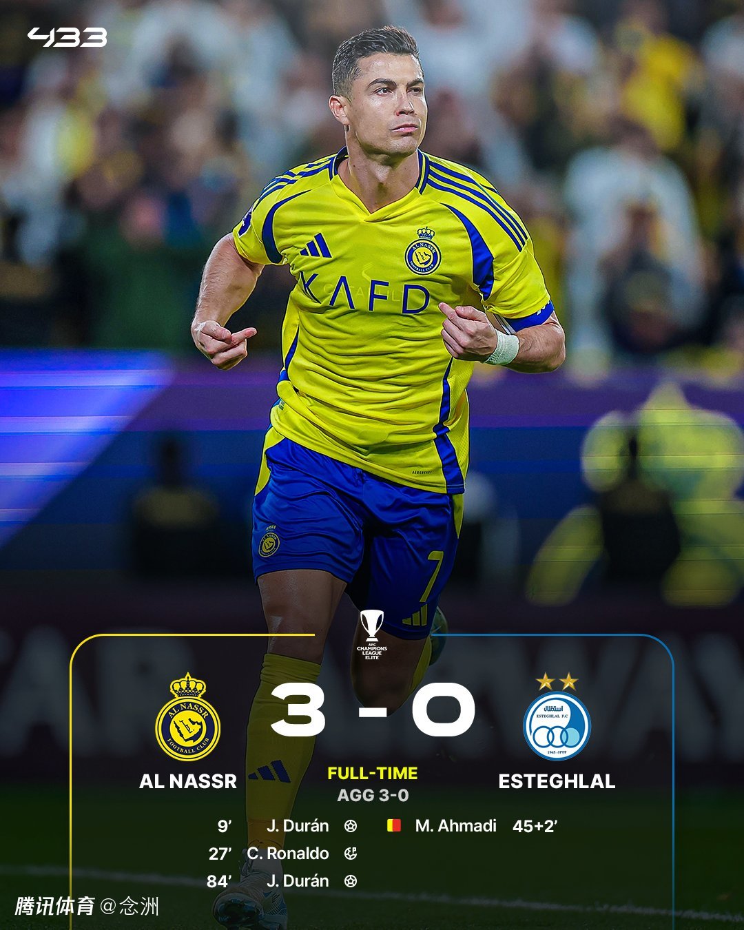 亚冠精英联赛西亚区1/8决赛次回合,利雅得胜利主场3-0击败德黑兰独立,总比分3-0晋级八强。杜兰吊射破门,马内造点,C罗点射扩大比分,艾哈迈迪两黄变一红被罚下,杜兰反击破门完成双响。