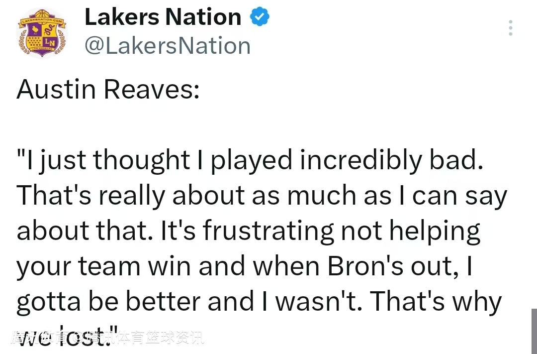 主动揽责!里夫斯:我今天在场上的表现极为糟糕 詹姆斯缺阵我本应该打得更好