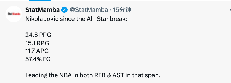 掘金常规赛对雷霆2胜2负!约基奇全明星后篮板助攻领跑全联盟