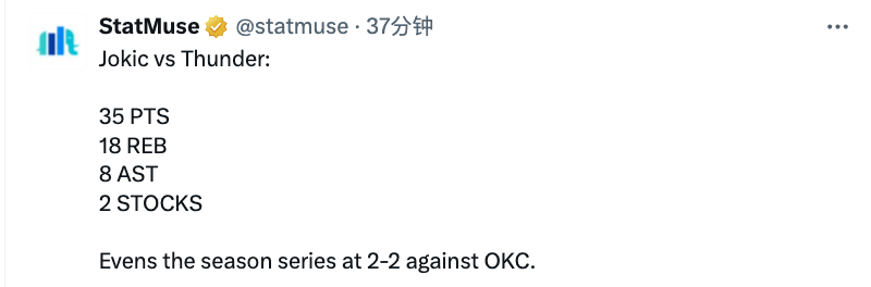 本场比赛约基奇首发出战39分钟,20中15,三分球2中1拿到35分18篮板8助攻1抢断1盖帽。在今天助队战胜雷霆后,掘金在常规赛和雷霆的4场对决,战绩为2胜2负。