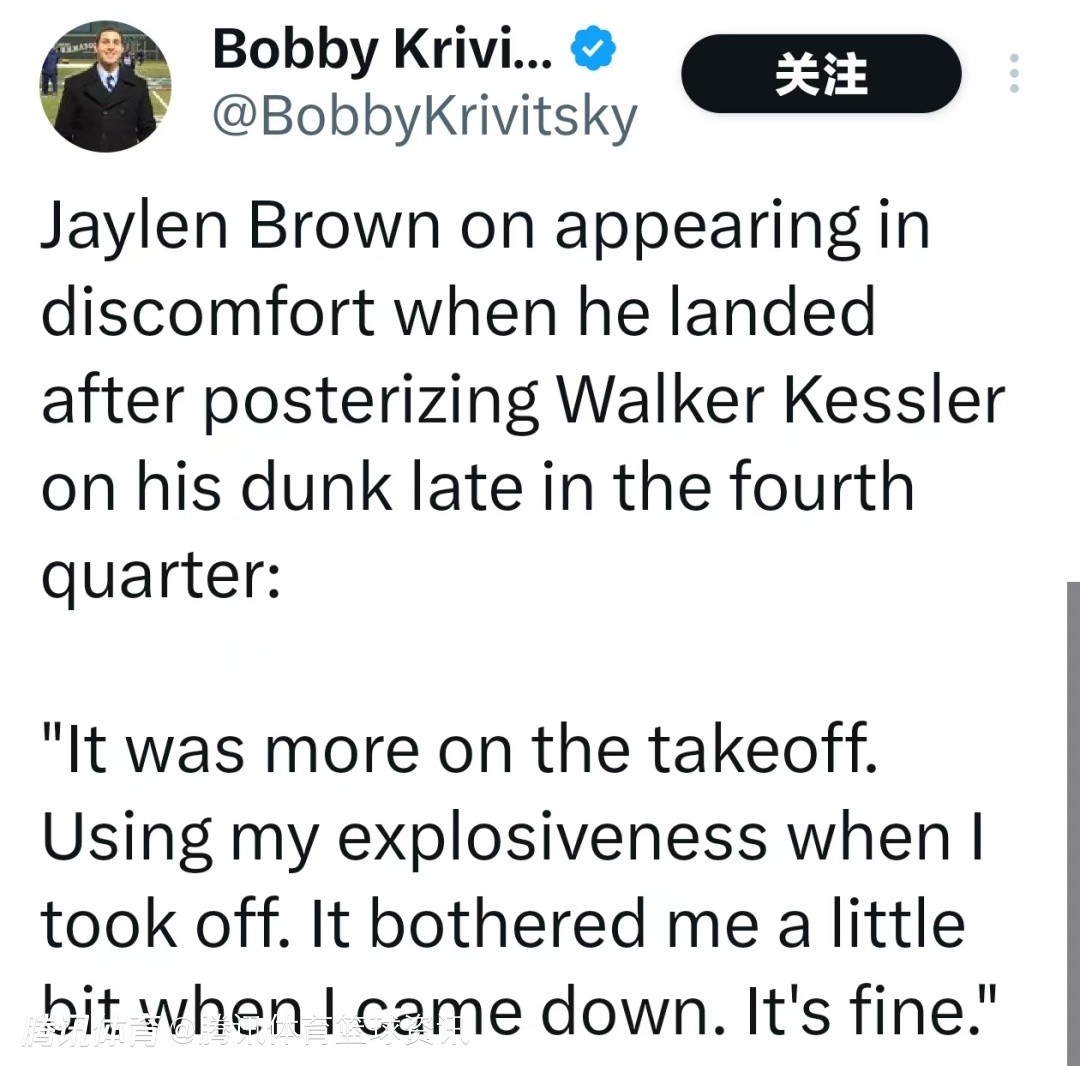 杰伦-布朗回忆起在第四节末扣篮隔扣凯斯勒后落地时的不适,他解释道:“其实主要是在起跳那一瞬间,我用力过猛,落地时才感觉有点不舒服,不过现在我已经没事了。”