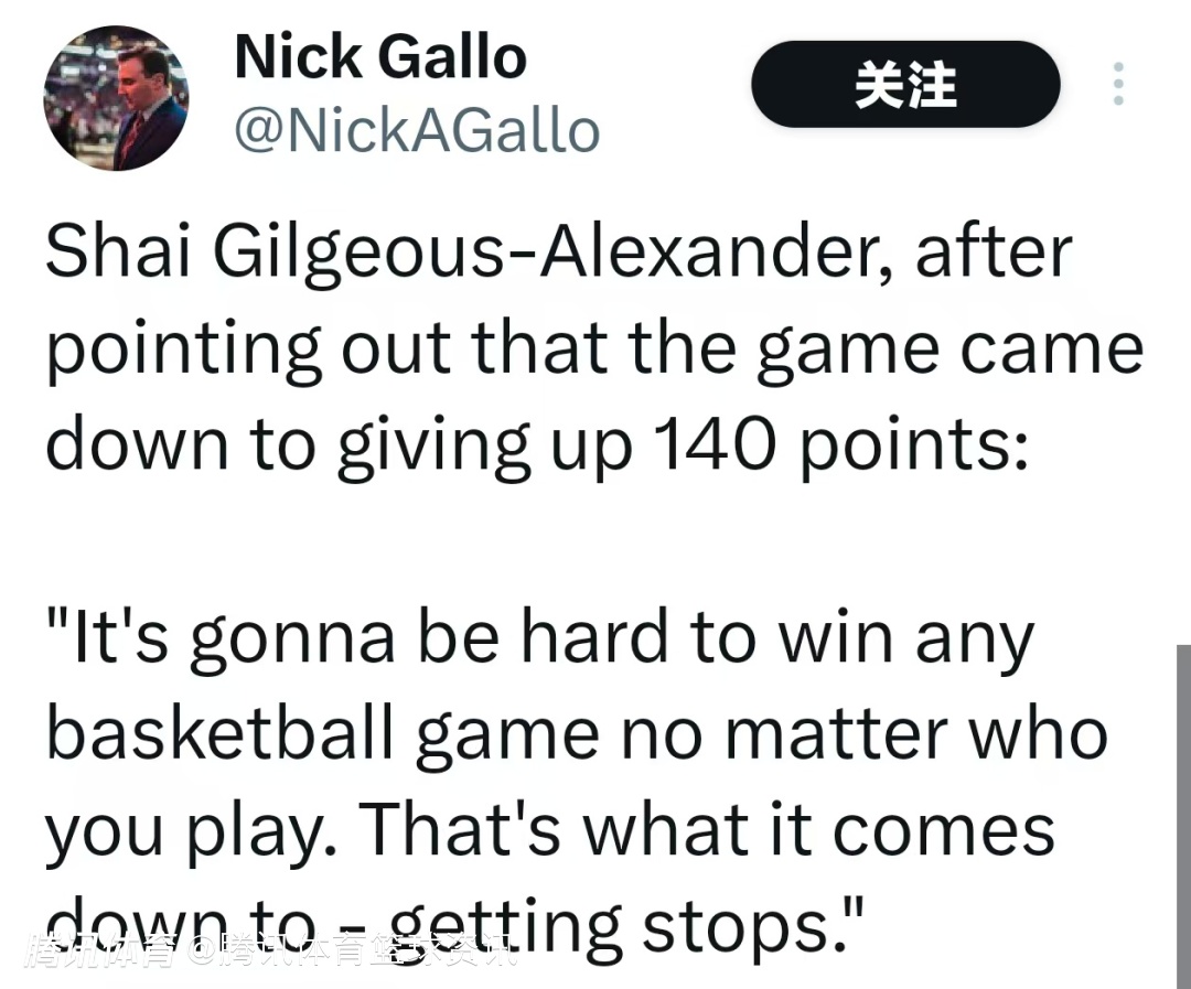 亚历山大提到比赛失利是因为让对手拿到了140分,他强调:“不管对手是谁,赢下任何一场篮球比赛都不容易,关键就是要防住对手。”