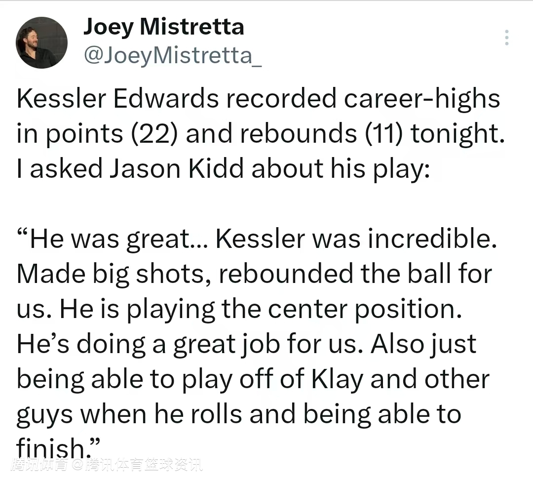 基德:凯斯勒-爱德华兹出任中锋表现出色 他与队友配合默契并命中了关键球