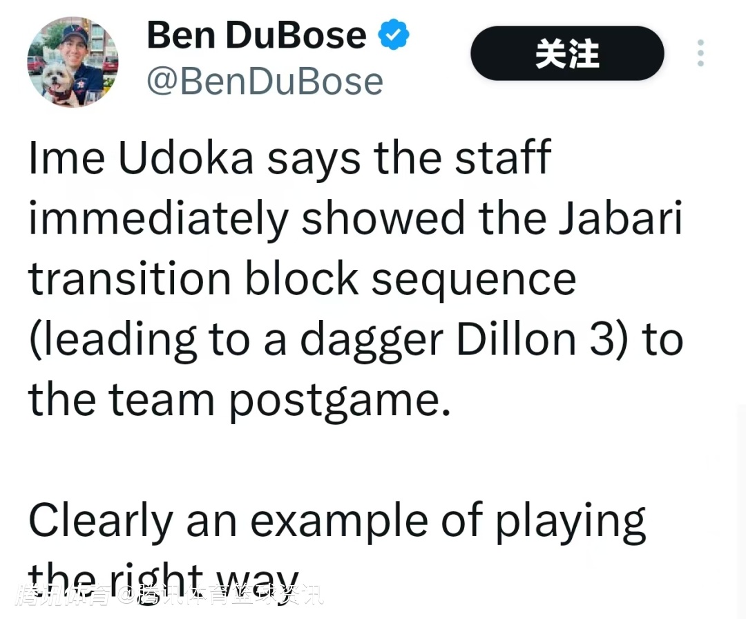 乌度卡还说道,比赛结束后,教练组立即向球队展示了小贾巴里-史密斯那次防守转换中的关键盖帽,随后队友狄龙投中致命三分的视频片段。他表示:“这显然是一个正确打球方式的典型例子。”