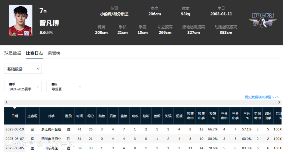 曾凡博过去3场比赛打山东得到33分刷新职业生涯新高,打四川得到21分,打浙江得到25分7篮板,这三场比赛投中了12个3分且命中率高达66.7%。面对山东,浙江为首的矮壮型锋线,曾凡博优势太大了,也让对手吃尽苦头。