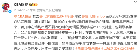 第二阶段初期,曾凡博尽管打出了一些高光的表现,但一些重要的比赛,曾凡博面临长时间被弃用的尴尬,或许有很多因素导致,但可以确定的是曾凡博并不是影响北京男篮直接胜负走势的绝对核心。