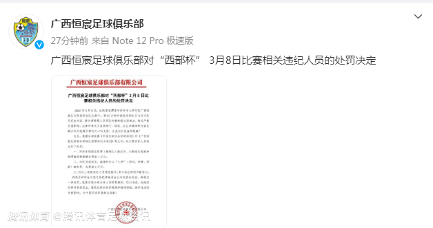 2025-03-11 20:50北京时间3月11日,广西恒宸足球俱乐部官方发布处罚决定,对“西部杯”赛事中相关违纪人员进行了处罚,具体决定如下: