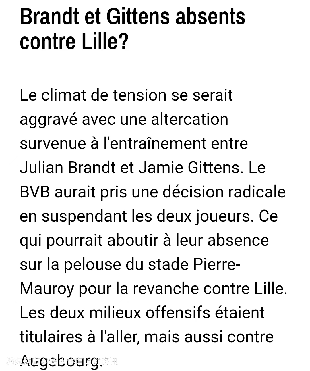 图片报:多特球员布兰特与吉滕斯在训练中发生冲突 对阵里尔一战可能双双缺席