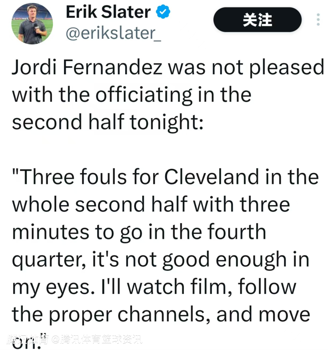 费尔南德斯还对比赛下半场的裁判工作表示不满:“骑士在下半场最后三分钟内只有三次犯规,这在我看来是不够的。我会回看比赛录像,通过适当的渠道来处理这件事,然后继续前进。”