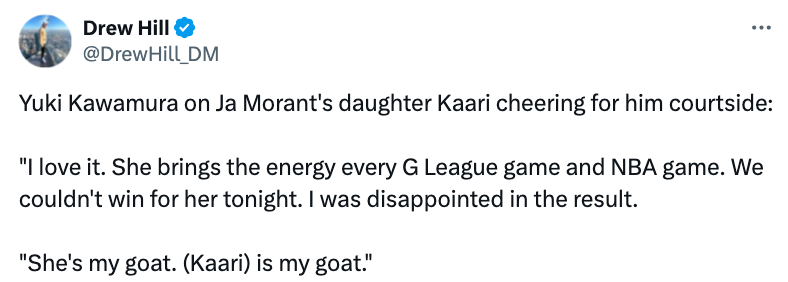 本场比赛,莫兰特的女儿和自己的爷爷(莫兰特父亲)来到现场,为河村勇辉加油助威,谈及此事,河村勇辉表示:“我很喜欢。她每场G联赛和NBA比赛都给我们带来了活力,今晚我们没能为她赢得比赛,我对结果感到失望,她是我的Goat。”