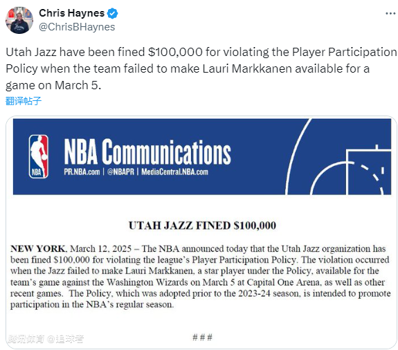 2025-03-13 07:00北京时间3月13日,NBA官方宣布重磅罚单,犹他爵士队因违反联盟球员参赛政策被罚款10万美元。据悉,此次违规发生在3月6日爵士对阵华盛顿奇才的比赛中,当时爵士未让马尔卡宁出战,此外他还缺席了近期的其他比赛。