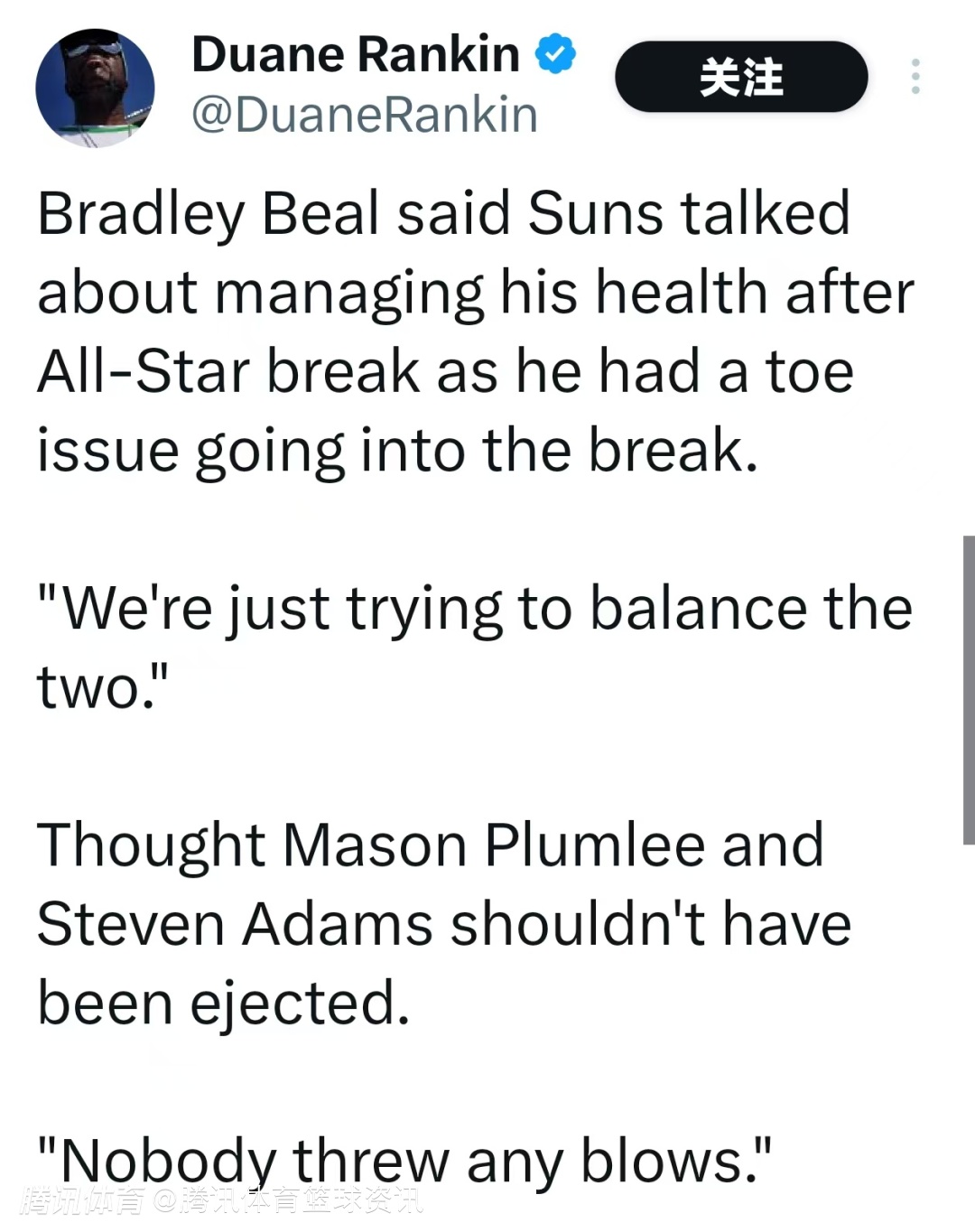 比尔透露,由于他在全明星赛前就受困于脚趾伤势,太阳队在全明星赛之后讨论了如何更好地管理他的健康状况。比尔说道:“我们只是在努力平衡比赛与健康之间的关系。”