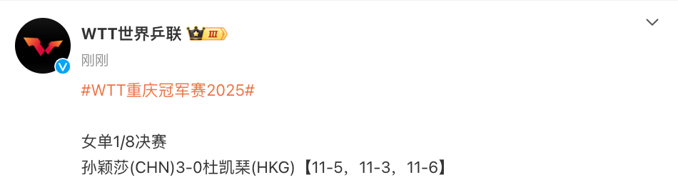 2025-03-13 19:40北京时间3月13日,WTT重庆冠军赛女单1/8决赛,孙颖莎3-0杜凯琹,晋级8强。