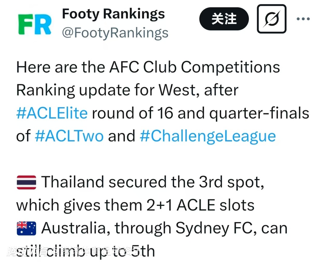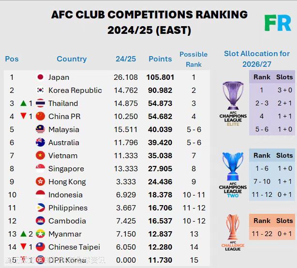 此前,上海海港和上海申花先后止步亚冠精英联赛16强,所有中国球队已于2024-25赛季亚冠各级联赛中被淘汰,亚足联俱乐部技术分确定被泰超反超后意味着2026-27的亚冠赛季,中超将只有1个亚冠精英正赛席位、1个亚冠精英联赛附加赛席位和1个亚冠2正赛席位。