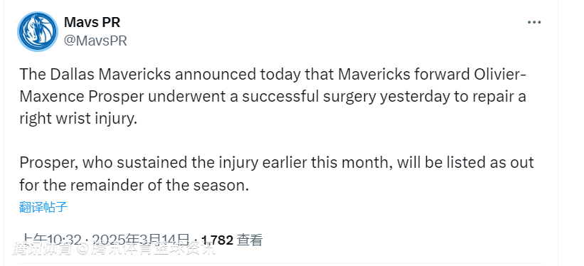 独行侠官方:普罗斯珀右手腕接受手术治疗 本赛季提前报销