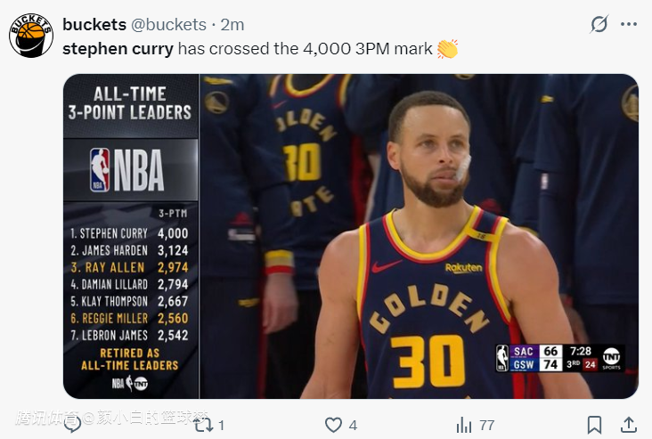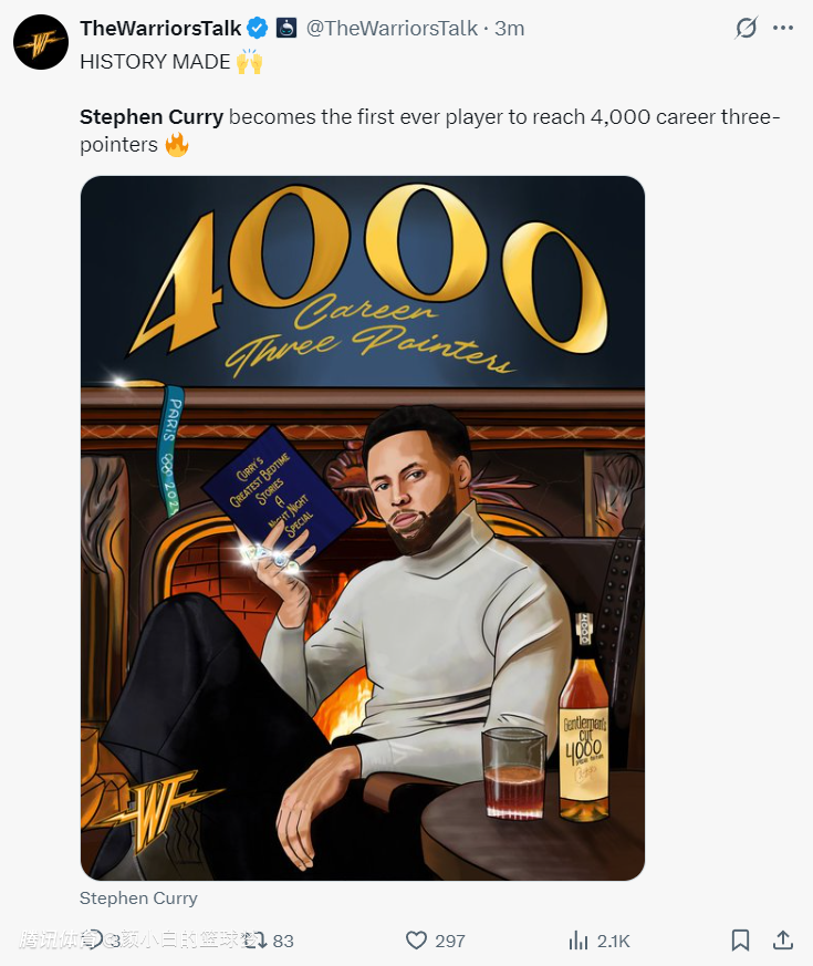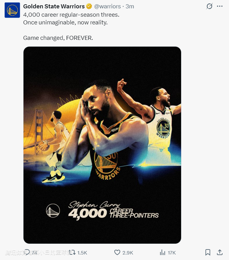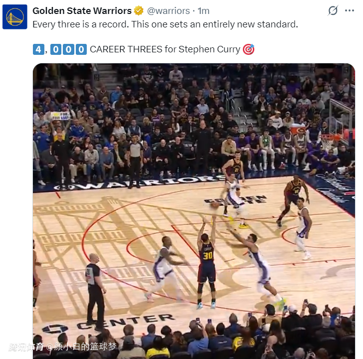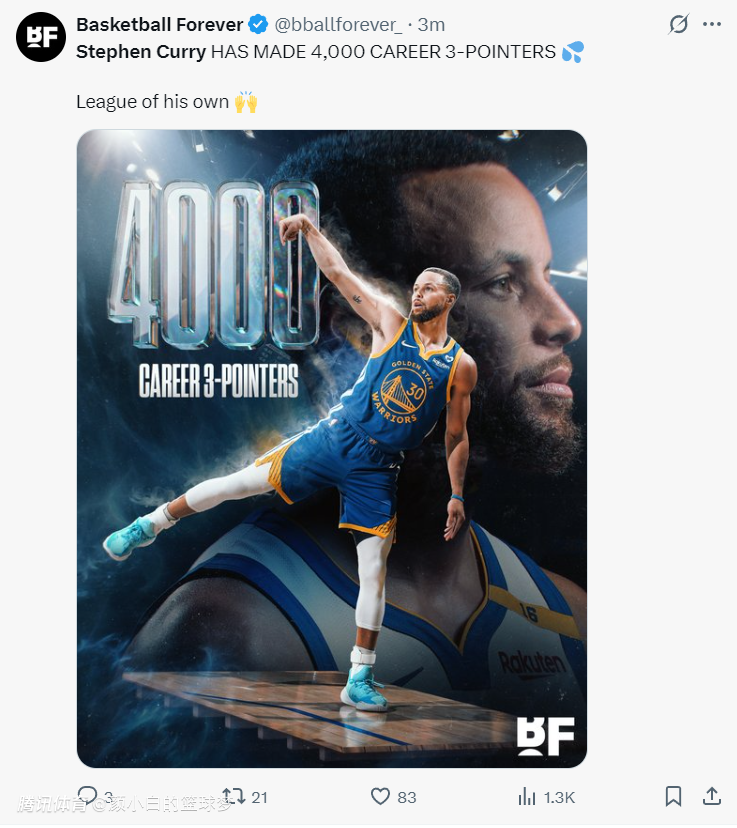 金州勇士队官方立马晒出了库里4000三分里程碑的海报庆祝,库里生涯场均出手9.3记三分,可以投进4.0记三分,命中率42.4%;本赛季场均出手11.3次投进4.5记,命中率39.8%。