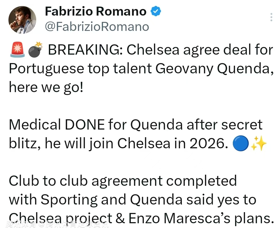 据罗马诺透露,切尔西与葡体达成协议,而且昆达愿意加盟切尔西。目前,昆达已经完成体检,不过他将继续留在葡体效力一个赛季,2026年正式披上切尔西战袍。