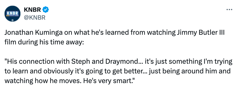 另外库明加也表示自己在缺席期间,有在看巴特勒的比赛录像:“他和库里、追梦的配合,这正是我在努力学习的,显然这会变得更好,我只是在他身边观察他的脚步移动,他打得非常聪明。”