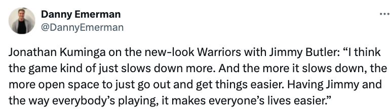 谈及巴特勒加盟之后的全新勇士,库明加表示:“我认为比赛节奏会慢下来。节奏越慢,就越有空间让你打球,可以让事情变得更容易,有了巴特勒和每个人的表现,大家都打得更轻松了。”