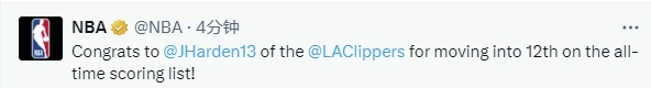 2025-03-15 09:40北京时间3月15日,NBA常规赛继续进行,快船队对阵老鹰队。本场比赛进行到第三节,快船队球员哈登拿到个人第23分,常规赛生涯总得分超越埃尔文-海耶斯(27313分),升至历史第12位。