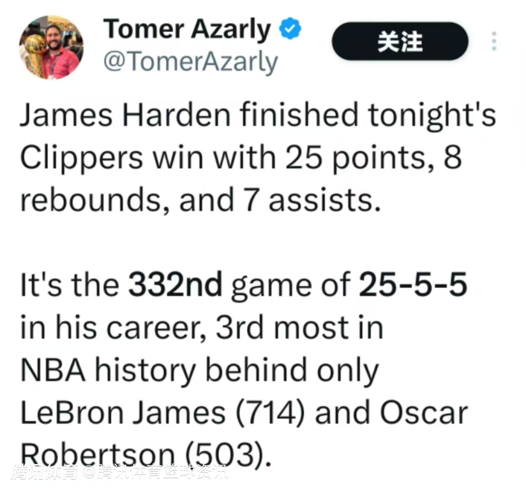 根据数据统计显示,这是哈登职业生涯中第332场比赛贡献至少25分5篮板5助攻,场次总数位居历史第3,仅次于勒布朗-詹姆斯(714)和奥斯卡-罗伯特森(503)。