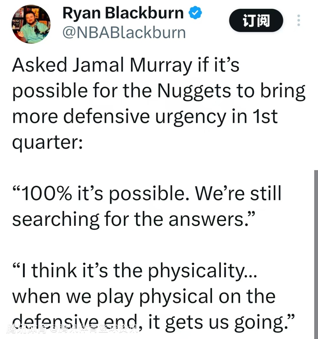 当被问及掘金队是否可能在首节提升防守紧迫感时,穆雷表示:“100%有可能。我们仍在寻找答案。”