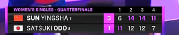 在此前两轮的较量中,孙颖莎分别以3-0的比分击败波尔卡诺娃以及杜凯琹。本场面对大藤沙月,第一局孙颖莎状态慢热,双方一路4平和6平。孙颖莎侧身爆抽擦网出界,大藤沙月发抢后又是接发抢攻,孙颖莎连续丢分6-10送出局点。随着大藤沙月重杀成功,孙颖莎6-11先丢一局,大比分孙颖莎0-1落后。