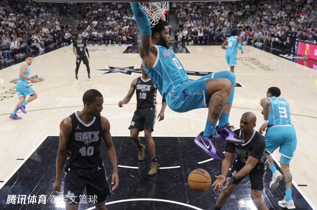 马刺两大主力文班亚马和福克斯均赛季报销,两队展开疯狂的进攻大战,黄蜂命中26记三分创造队史纪录,马刺同样回敬21记三分。黄蜂在首节比赛就拉开分差,第二节比赛轰出单节44分高分,最多领先马刺31分,尽管马刺末节试图缩小分差,不过无奈前期分差过大,在比赛时间走完前无缘抹平分差,最终马刺不敌黄蜂。