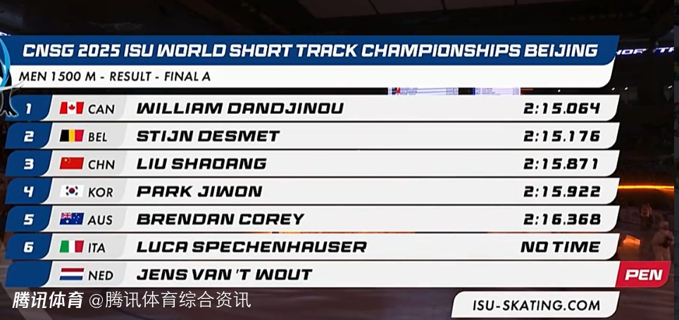 短道速滑世锦赛男子1500米:刘少昂摘铜 加拿大选手封王