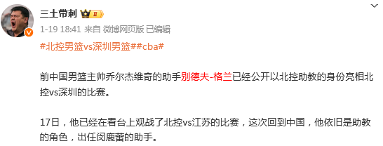 根据国内媒体的报道,别德夫-格兰在今年的1月中旬,他独自回到中国,出任北控男篮助理教练员的职务。
