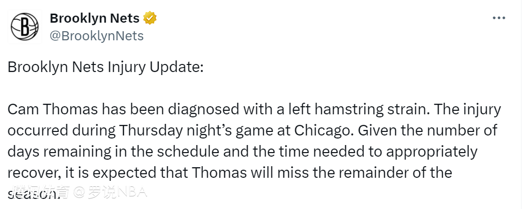 2025-03-16 06:40北京时间3月16日,布鲁克林篮网官方宣布,卡姆-托马斯被诊断出左大腿后侧肌群拉伤。鉴于本赛季剩余赛程天数以及恰当康复所需时间,预计托马斯将错过本赛季剩余的所有比赛。
