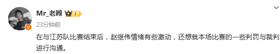 根据媒体人“老顾”发文:在与江苏队比赛结束后,赵继伟情绪有些激动,还想就本场比赛的一些判罚与裁判进行沟通。