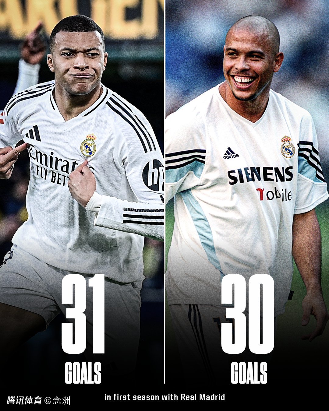数据统计显示,姆巴佩本赛季各项赛事43场打入31球,超越了“外星人”罗纳尔多在皇马首个赛季的30球,而C罗在皇马的首赛季进球数是33球,只差2球。