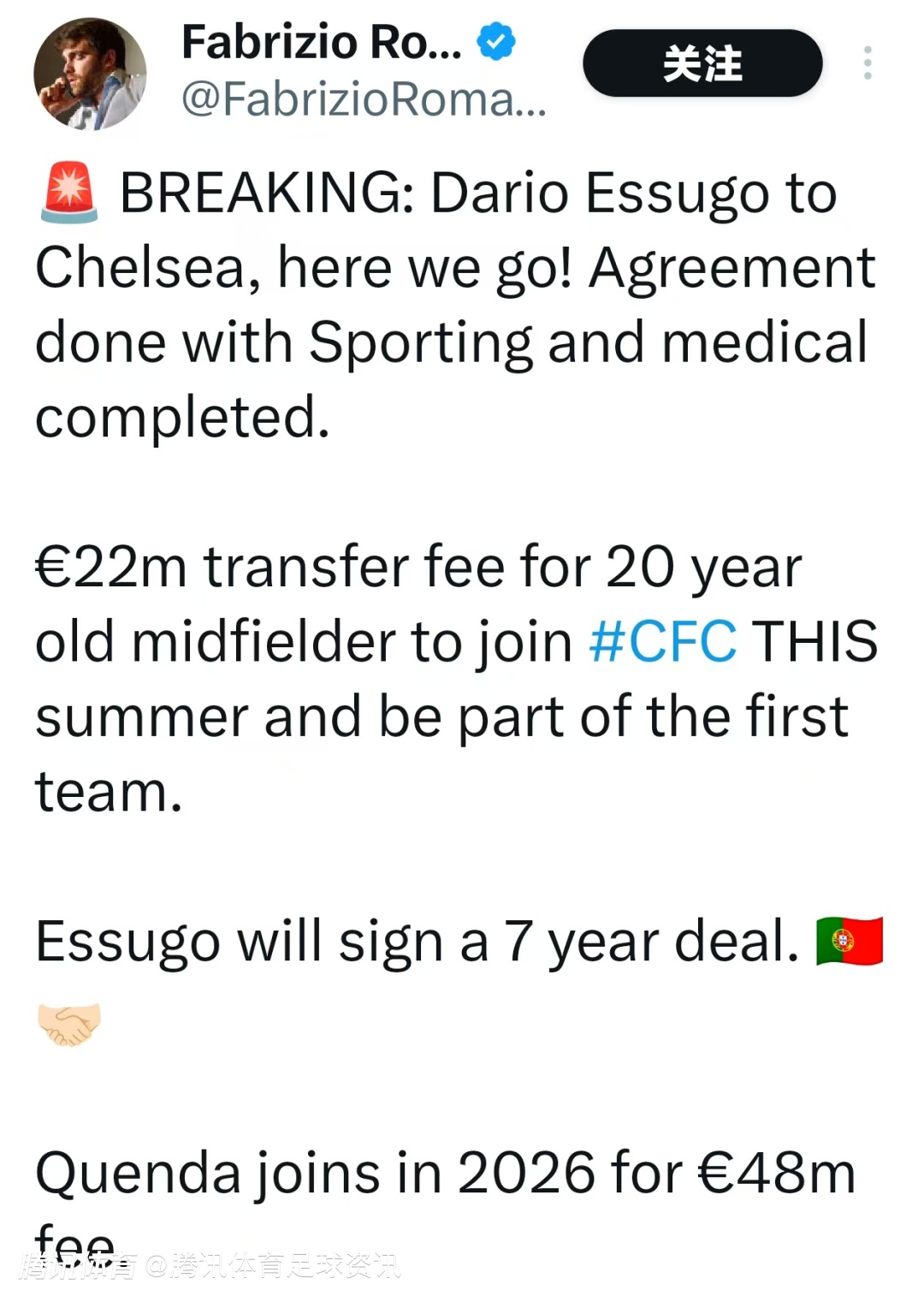 这是继昆达之后,切尔西本周与葡萄牙体育完成的第二笔交易。