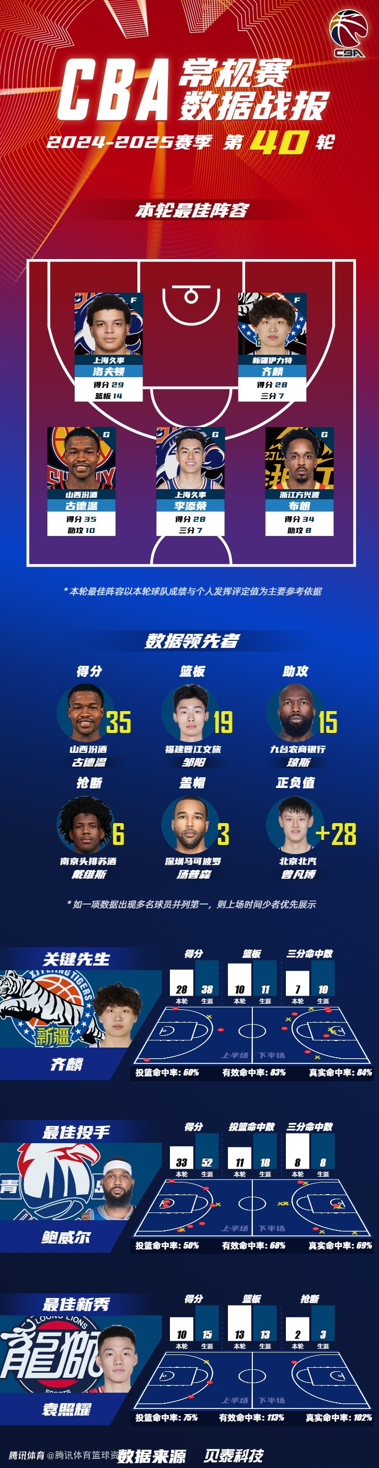 2025-03-16 09:20北京时间3月16日,CBA联赛常规赛第40轮结束较量,CBA官方公布本轮最佳阵容,来自上海久事大鲨鱼的洛夫顿(29分14篮板)和李添荣(28分7三分),新疆广汇篮球俱乐部的齐麟(28分7三分),山西汾酒职业篮球俱乐部的古德温(35分10助攻)和浙江广厦篮球俱乐部的布朗(34分8助攻)入选CBA联赛常规赛第40轮最佳阵容。