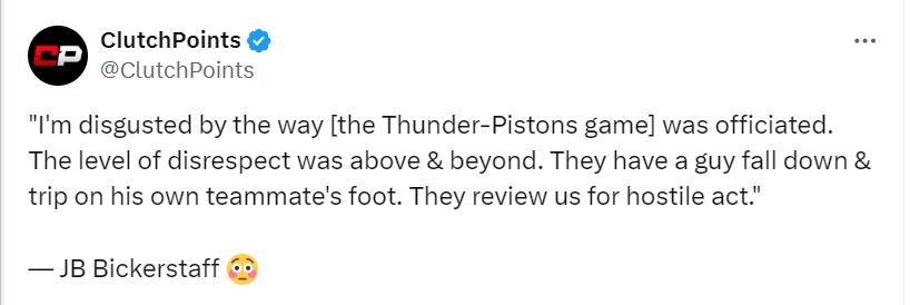 比克斯塔夫说道:““我对雷霆与活塞这场比赛的裁判表现感到极度不满。裁判的这种不公平行为简直令人难以接受。球员摔倒,明明是自己队友的脚绊到了他,裁判却反过来审查我们这边是否有恶意行为,这实在是荒谬至极。”