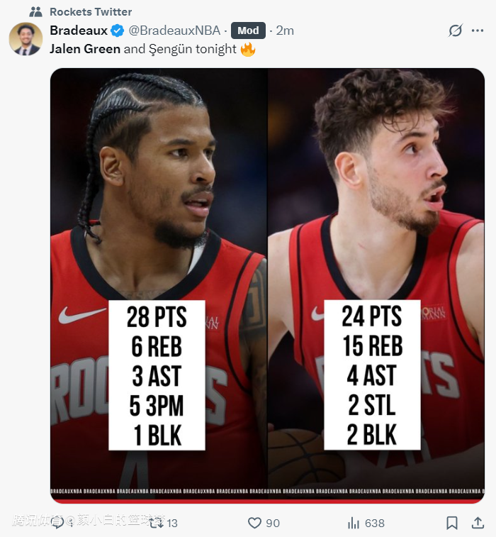 第二节格林还真的听劝了,他第二节再度绑辫子卸下了发带,果然单节6分钟里3中3+三分2中2拿到8分3助攻,他一波连拿8分一度帮助火箭反超过,半场格林已经拿到12分。