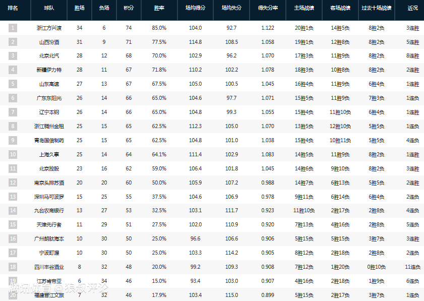40轮过后,广厦男篮的战绩为34胜6负,继续稳坐联盟第一。