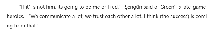 在谈到杰伦-格林在比赛最后时刻的出色表现时,申京说道:“如果不是他,那就是我或者范弗利特会挺身而出,我们之间沟通过很多次,非常信任彼此。我认为我们之所以能取得成功,就是源自于此。”