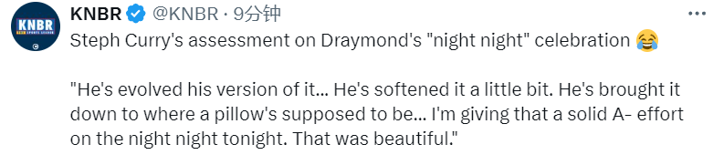 谈到本场比赛格林做出的“晚安”动作,库里这样说道:“格林改进了我的‘晚安’庆祝动作,让它更柔和了一些,他把它放到枕头应该在的位置。就他今晚的‘晚安’庆祝,我给他打个挺不错的A-,太漂亮了。”