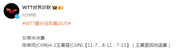 WTT重庆冠军赛女单半决赛:王曼昱因伤退赛 陈幸同晋级决赛将对阵孙颖莎