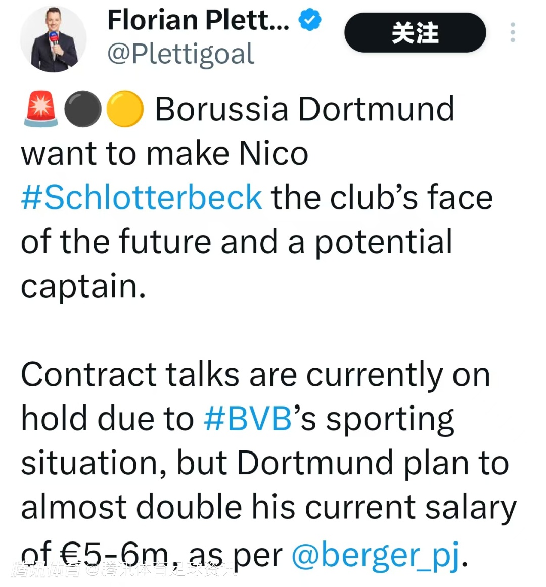值得注意的是,由于当前多特蒙德在联赛中的战绩表现尚未达到预期的理想状态,这使得原本计划中的合同谈判不得不暂时被搁置。不过,多特蒙德方面已经明确了计划,一旦续约成功,施洛特贝克的年薪将会实现翻倍。据悉,施洛特贝克目前的年薪处于500-600万欧元的区间。