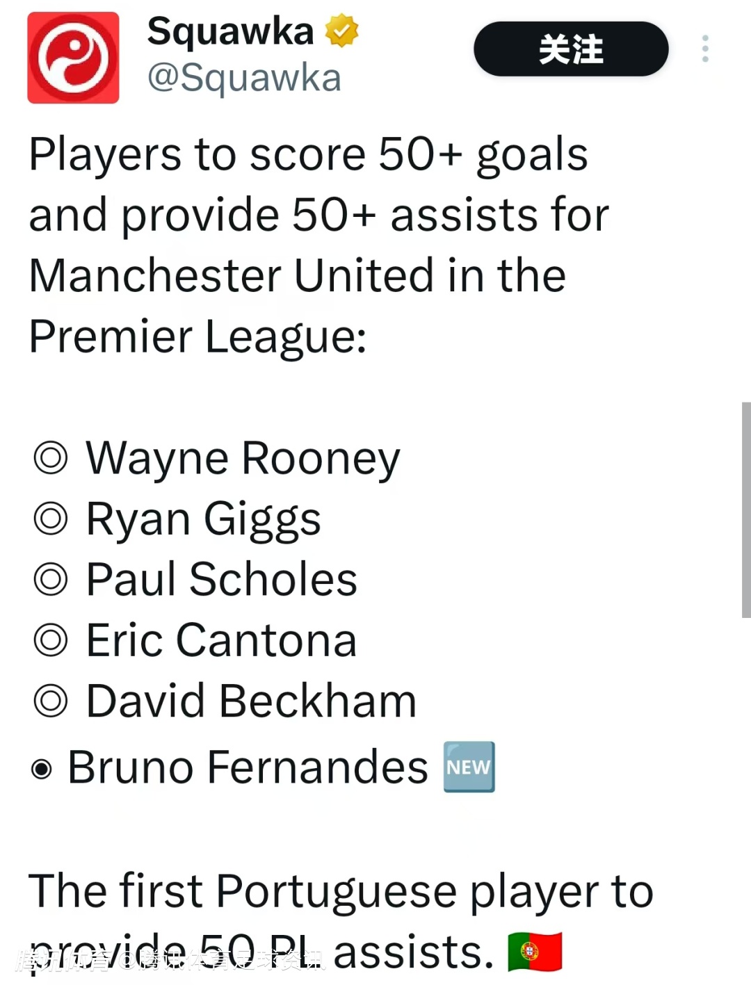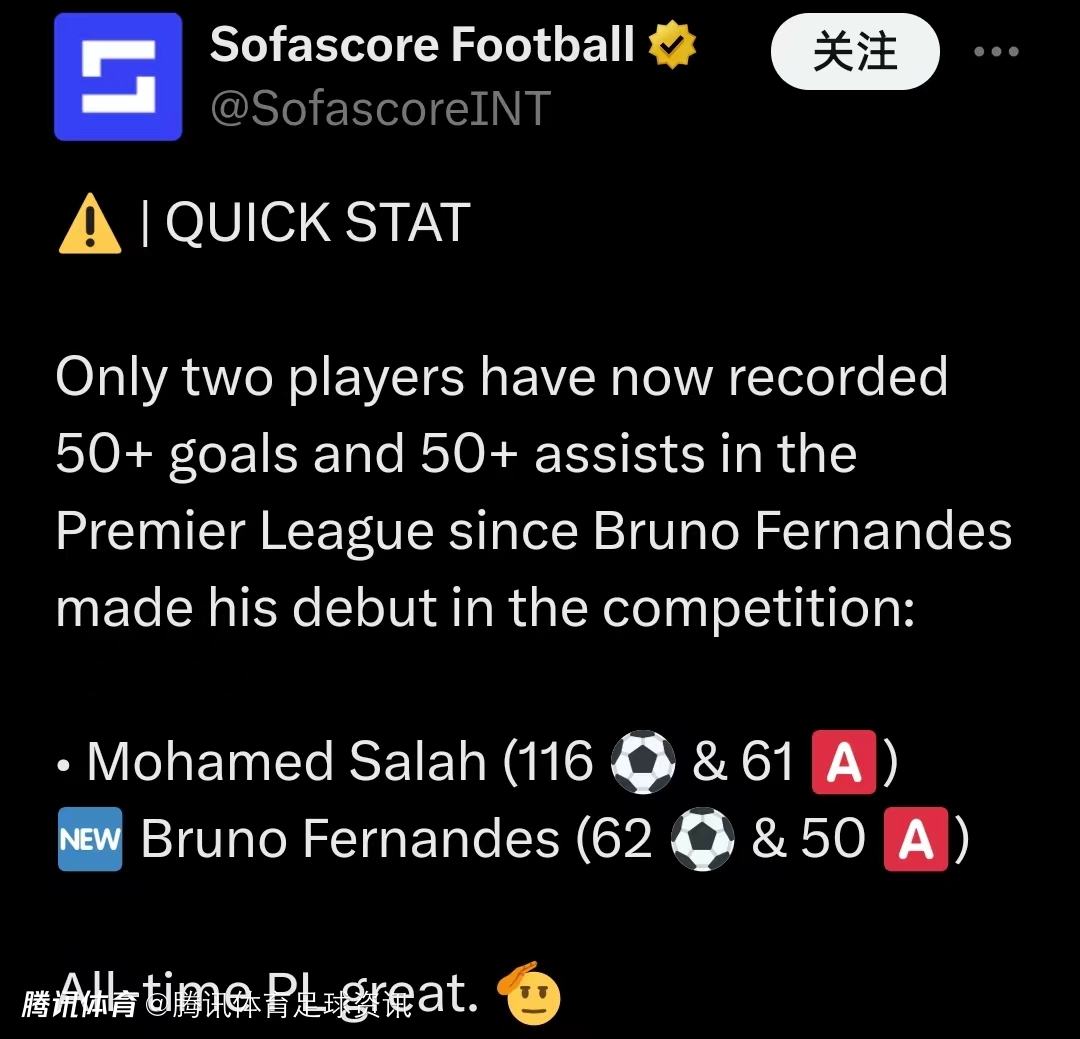 根据数据统计显示,凭借此役的高光表现,B费在英超生涯已累计打进62球并送出50次助攻,成为曼联队史上第6位英超进球和助攻均达到50+的球员,此前5人分别是鲁尼、吉格斯、斯科尔斯、坎通纳、贝克汉姆。他个人则成为英超首位助攻50+的葡萄牙球员。