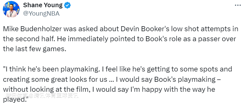 在谈到布克下半场比赛投篮命中率较低的话题时,布登霍尔泽表示:“我认为他一直在组织进攻,我认为他已经到达了一些位置,为我们创造了一些很好的机会,我想说布克在传球,不用看录像,我就会说我对他的表现很满意。”本场比赛,布克出战40分钟,17投6中得到19分6篮板11助攻1抢断。
