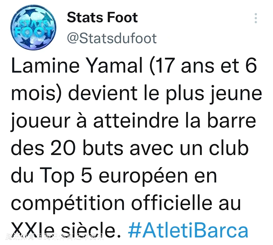 根据数据统计显示,凭借这关键一球,亚马尔在17岁零8个月(亚马尔生日2007年7月13日)时代表巴塞罗那出战89场便达成20球成就,成为本世纪在五大联赛俱乐部中打进至少20球的最年轻球员。