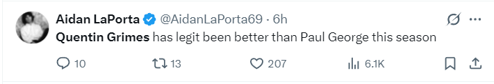 费城记者Aiadn LaPorta写道:就本赛季的表现来看,格兰姆斯的确比保罗乔治更出色。
