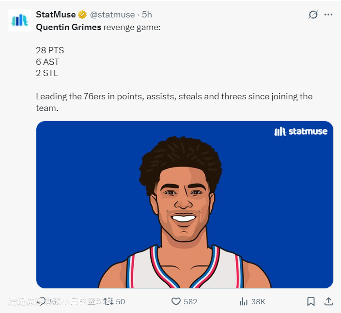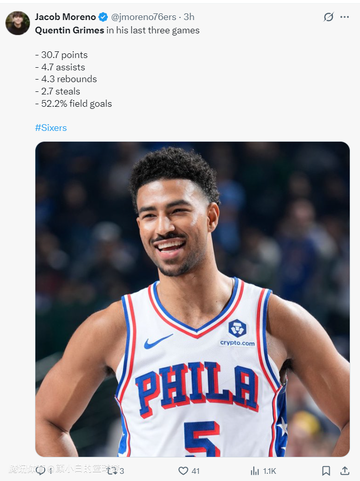 数据媒体StatMuse写道:自格兰姆斯交易到费城后他的得分、助攻、抢断都是全队最高。
